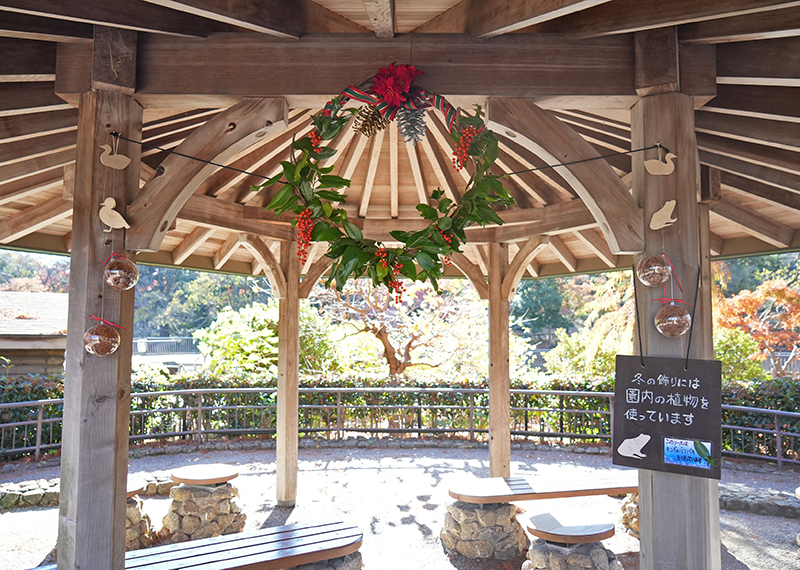 井の頭自然文化園では、園内の植物や身近な自然素材を使って、リースやオーナメントなどの冬を彩るかざりつけをおこなっています。地球にやさしい素材を使い、樹木に囲まれた園内の景色に溶け込むような、心がほっとあたたかくなるかざりつけです。