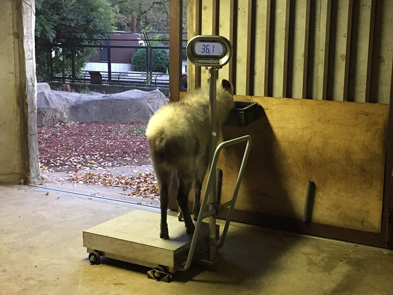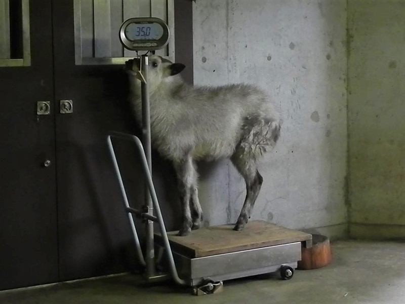 2020年5月初旬、家畜用に購入した体重計(計量台の大きさ:50cm×70cm)を使用し、チャレンジを開始しました。当初はカモシカが体重計に乗らなければ食べられない場所に嗜好性の高いえさを設置し、誘導を試みました。飼育係は安全のため、カモシカのいる部屋の外からそっと見守り、数値を記録します。えさの種類やその設置場所、実施する時間、体重計を置く位置など、何度も失敗と調整を繰り返し、数日の格闘の末なんとか体重計に乗ってもらうことができました。1回だけの数値では情報として少ないため、これを毎月繰り返しその体重の変化を追うことにしました。