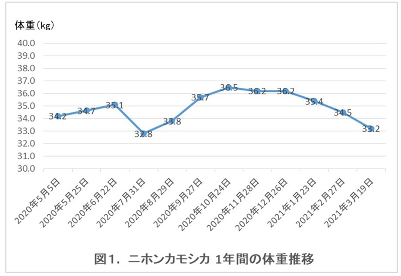 10月に入ると急激に食欲が増加したため、再度えさで誘導する形と併用し、現在も体重測定を継続しています。定期的に継続したためか、今年に入り食欲が少し低下してからも、体重計を設置するとすぐに乗ってくれるようになってきました。結果の数値を確認すると、季節による食欲の波と一致するように、32kg~37kgを推移していることが分かりました。カモシカ成獣♂では、体重が35kg~40kgであるという報告が多く、そのため現時点では良好な体型を維持できているのではないかと考えています。
