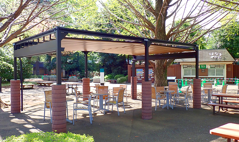 園内2か所のフードショップ付近にオーニング(日よけ)を設置しました。日差しが強い日でも休憩しやすくなりましたので、ぜひご利用ください。