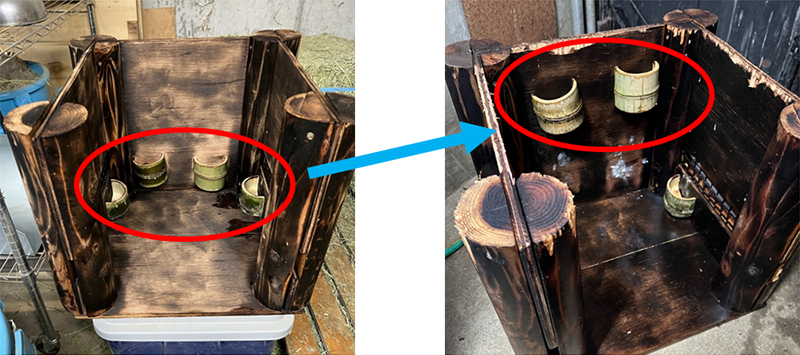 そこで、次の作戦として、外から手を伸ばしても届きにくい奥のほうにえさを入れた竹皿を設置することにしました。竹皿を使うことで、えさが外から見えにくく、取りづらくしました。