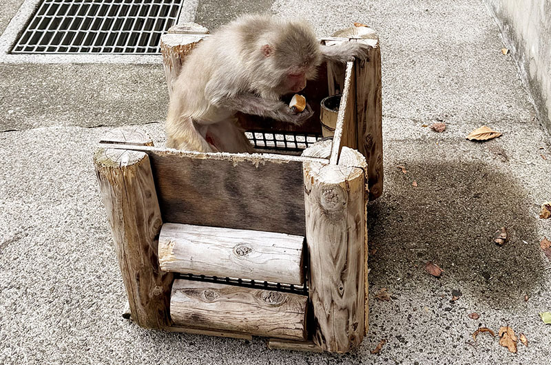 次に、体重計にシモブクレ以外のサルが体重計に乗ってしまうことがないよう、木製の箱型のえさ台を作成しました。慣れてもらうために、まずはえさ台だけをサル山に1か月間設置し、給餌の際はそこにえさを置いてシモブクレの反応を見ることにしました。