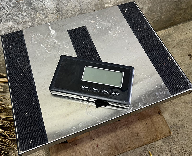 えさ台の上にしっかりと乗れるようになったので、測定中に体重計がずれて、えさ台が倒れたり、ガタガタと動いてきちんと測れなくなったりするのを防ぐため、最後に体重計と箱型のえさ台のあいだにマジックテープを貼り固定しました。
