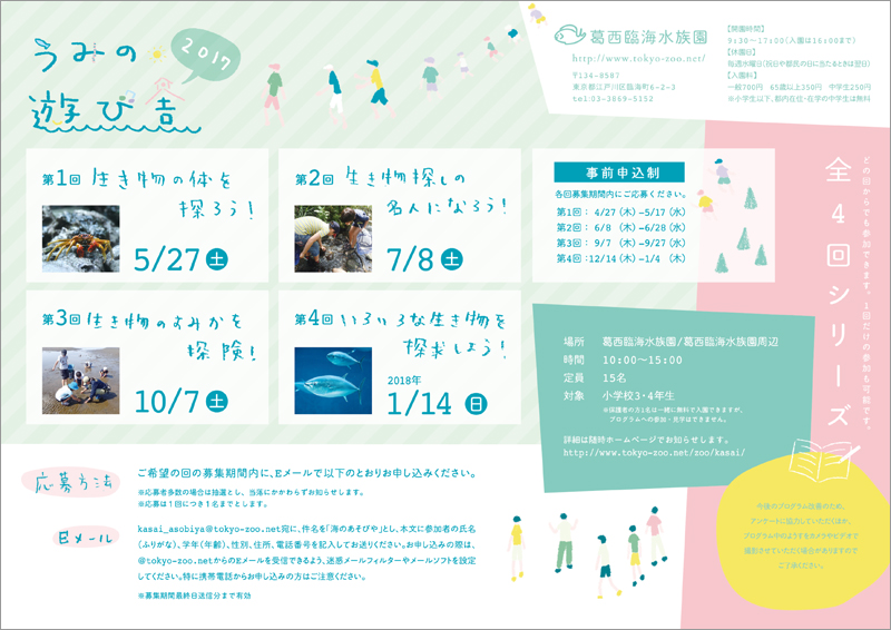 kasai_asobiya@tokyo-zoo.net宛に、件名を「海のあそびや」とし、本文に参加希望者の氏名(ふりがな)・学年(年齢)・性別・住所・電話番号を記入してお送りください。