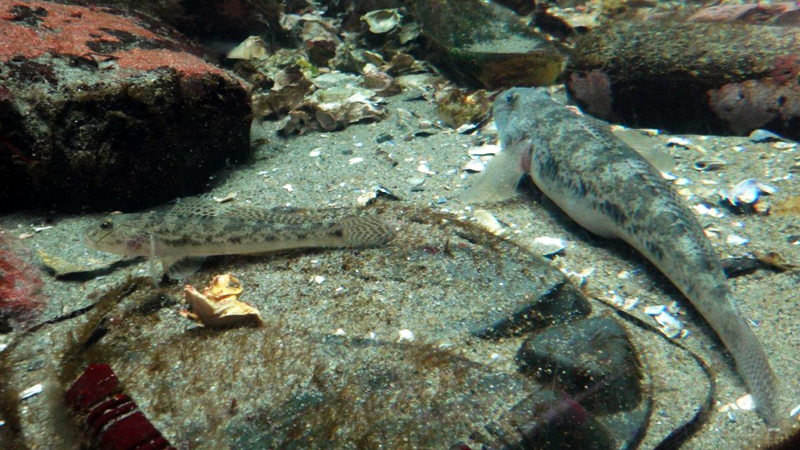 左が今年生まれのマハゼ。右は全長20センチをゆうに超える昨年(2013年)生まれの巨大マハゼ