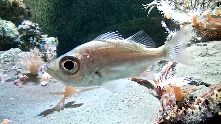 水深 200メートルほどの深海に生息しているため、採集時にダメージを与えないように工夫したり、採集後も管理には細心の注意を払ったり、なかなか長期飼育の難しい魚です。しかし、試行錯誤の結果、やっと安定して飼育できるようになり、デビューを飾ることができました。