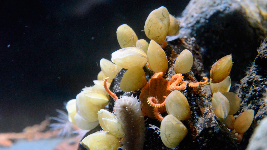 最後はウミホオズキチョウチンという生き物です。一見アサリやハマグリなどと同じ貝類に見えますが、まったく別の「腕足類」と呼ばれる生物グループに属しています。貝類のように殻を頻繁に動かせる筋肉はあまりないようで、殻を少し開けたまま、中にある毛の密集した器官で餌をとります。また、肉茎と呼ばれる部位で岩などに体を固定できるのも貝類にはない特徴の一つです。ウミホオズキチョウチンはおよそ5億年前からほとんど姿形を変えていないと言われ、「生きた化石」とも呼ばれています。