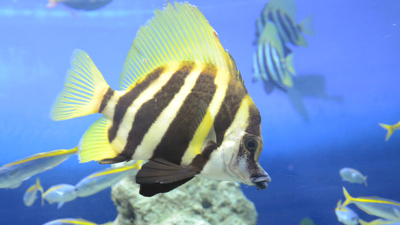 大きな背びれをもつ扁平した黄色い体に黒い縞模様、さらに尖った口の下にヒゲ状のヒダを蓄えるのが特徴のテングダイ。全長40〜50センチにもなるテングダイが悠々と群れ泳ぐ姿は圧巻です。テングダイは、国内では北海道から九州・八丈島・小笠原諸島などの水深18~250メートルの砂地や岩場にくらすスズキ目カワビシャ科の魚です。このたび葛西臨海水族園「東京の海」エリアの「伊豆七島の海2」水槽では、テングダイを10尾増やしました。