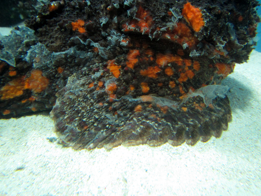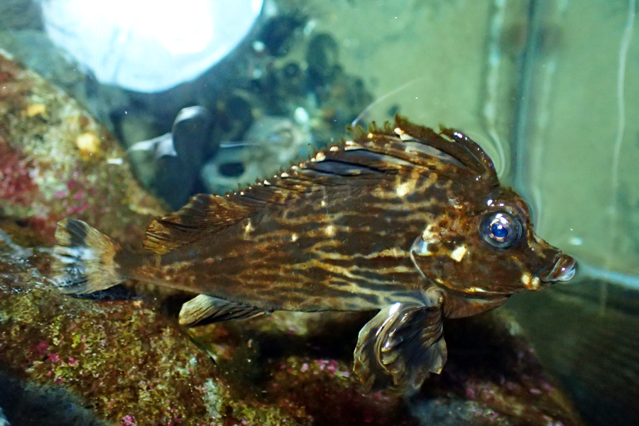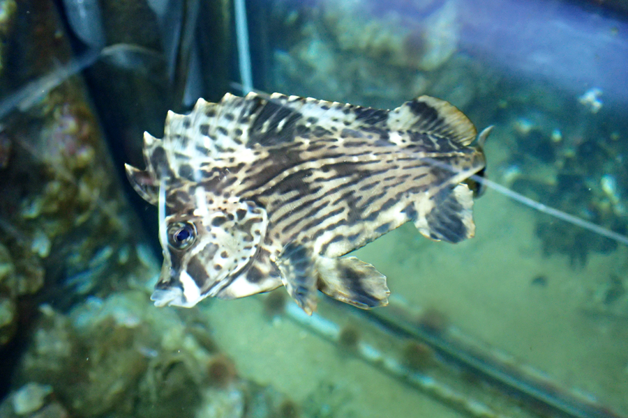 まず、「モーリシャス」水槽で展示中のオニダルマオコゼです。岩のような姿形をしているこの魚は、じっと動かずに待ち伏せして顔の真上を通る生物を一瞬で丸のみにします。あまりにも動かないその体をよく見ると、体中にコケが付着しています。そのおかげもあってか、水槽に入っている岩とそっくりです。
