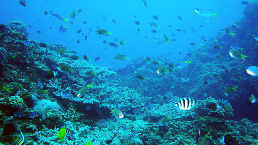 調査地の水深は約10メートル、好条件であれば20メートルほど先を見通せる透明度で、目視観察には最適です。海底は黒っぽい岩場と白い砂地にわかれ、岩場には小規模なサンゴ群落も見られます。そのサンゴ群落のあいだを群れ泳ぐスズメダイ類、黄や緑など色鮮やかなベラ類やチョウチョウウオ類などの小型の魚たち、これらの群れの中を悠々と泳ぐ全長40センチほどの大型のブダイ類などが印象的でした。
