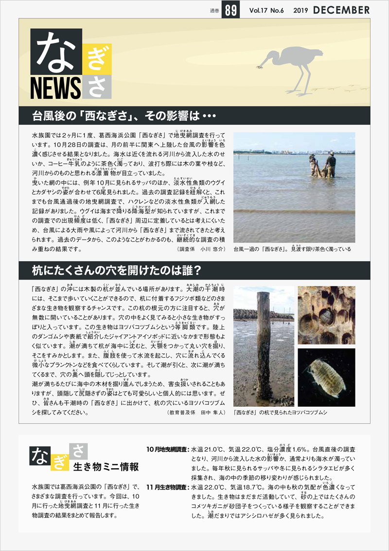 最新号の89号(2019年12月)を公開しました。10月に関東に上陸した台風による「西なぎさ」への影響のほか、「西なぎさ」の木の杭にくらす生き物について紹介します。