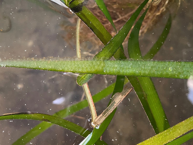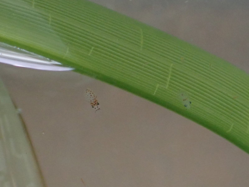 | アマモの葉に産みつけられたヒメイカの卵 | 水槽内でのヒメイカの稚仔 |