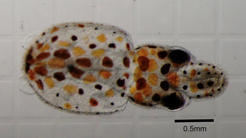 小さなヒメイカの姿を顕微鏡で観察すると、大きさは2.5mmほどでまだ長い腕はありませんが、イカやタコにある色素胞という体の色を変えるときに役立つ細胞を確認することができました。