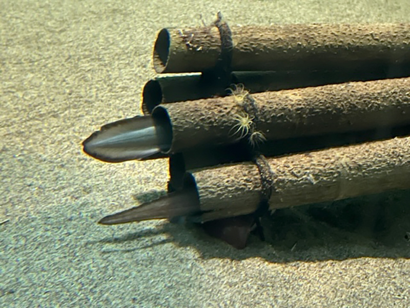 次の写真のように竹筒に隠れ、尾びれだけが見えていることがあります。2つ見えている尾びれのうち、丸みを帯びているのがニホンウナギの尾びれで、尖っているのがマアナゴの尾びれです。