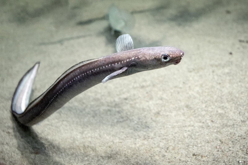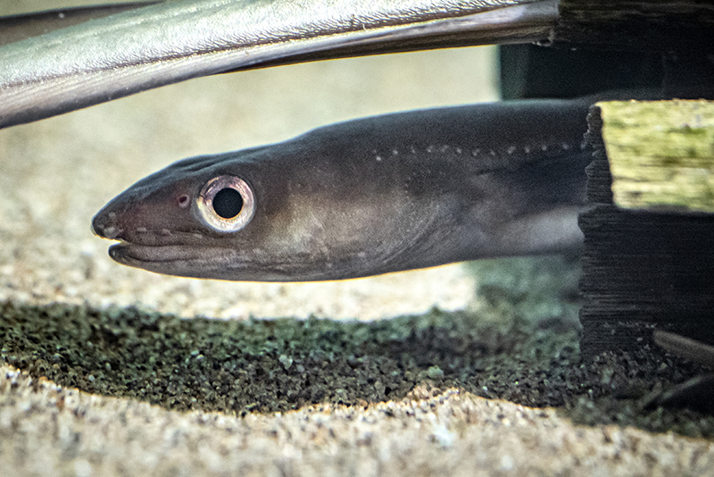 この白い斑点は、側線という水の動きなどを感じ取る感覚器官に沿って並んでいます。側線はニホンウナギにもありますが、マアナゴのように目立ちません。水槽では竹筒のなかや下に身をひそめていることが多いですが、タイミングよく全身を見ることができたら、ぜひ観察してみてください。