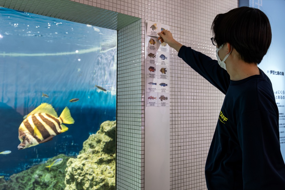 まず1つ目は、生き物の健康状態の観察です。調子が悪くなって一時的に裏側の水槽に移動する場合、飼育展示係から連絡が入りますが、あらかじめ観察していれば状況がすぐ理解できます。公開が中止になる場合、水槽の近くにある展示生物のラベルを剥がしています。新しくデビューした生き物は、健康状態が安定していればラベルを貼り出します。