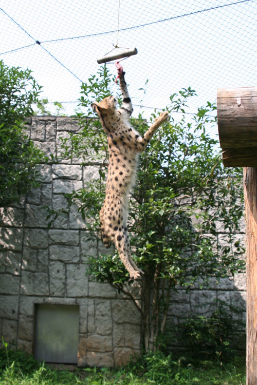 「サーバルジャンプ」とは、サーバルが飛び立つ鳥を捕まえるときに見せるジャンプを再現した催しで、運動場の上から吊り下げたお肉を、サーバルがジャンプしてとります。華麗なジャンプ力をぜひご覧ください。