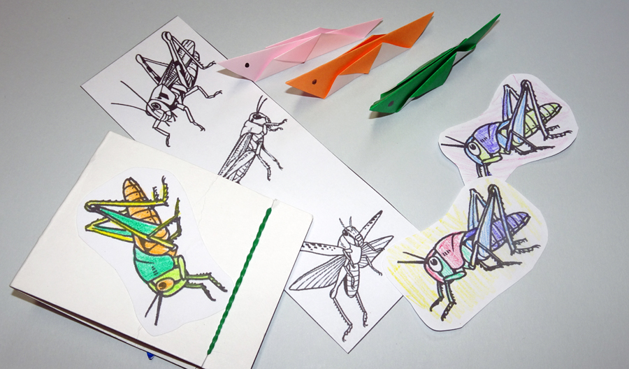 印刷されたバッタの線画に塗り絵をしましょう。できあがった絵を厚紙に貼りつけ、輪ゴムをかけると、バッタのように跳ねるおもちゃができあがります。小さなお子さまにおすすめです。