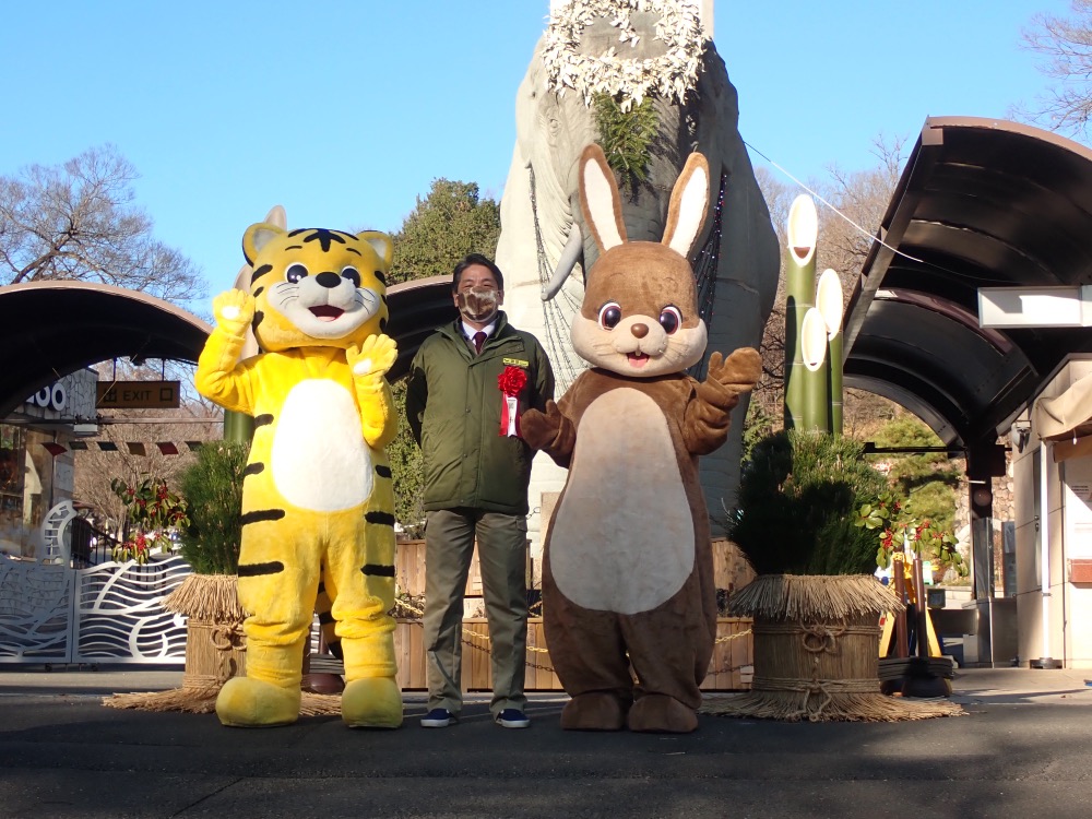園長が新年のごあいさつをするとともに、ご来園いただいたみなさまを着ぐるみがお出迎えします。