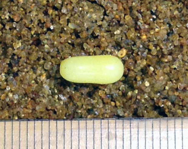 多摩動物公園昆虫生態園では昨年(2014年)12月から飼育を始め、今年の1月から展示しています。先日、飼育ケースを掃除していると、底に敷いた砂の中に産みつけられた卵を見つけました。卵の色は乳白色。大きさはなんと長径約1センチ。ナミアゲハの卵の直径が約1.2ミリ、カブトムシの卵は長径約2ミリ。これらと比較するとマイマイカブリの卵はかなり大きいと言えるのではないでしょうか。この卵から生まれてくる幼虫がいったいどのくらいの大きさなのか今から楽しみです。