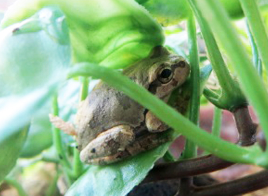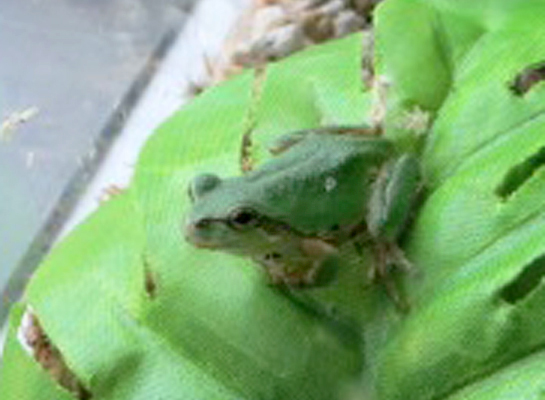 ニホンアマガエルの特徴は、体の色が周囲の環境によって変化するということです。実際、飼育を始めた頃は鮮やかな緑色でしたが、周囲の色と同調するだけでなく、太陽の光の強さや湿気も影響する結果、茶色や白っぽい色に変化したり、模様が生じたり、さまざまに変化しました。水入れ容器のピンク色に同調したのか、白っぽいピンクに変色したものもいました。