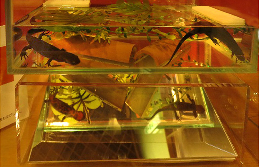 アカハライモリもニホンアマガエルと同じく、かつての日本ではなじみ深い動物でした。皮膚の粘液には毒が含まれ、名前の由来にもなっている赤いお腹は敵に対する警告色と考えられています。企画展では、この赤いお腹を見ていただくため水槽下に鏡を置きました。葉の上などで休むこともありますが、よく動くので、じっくり見ているとこの特徴的なお腹を見ることができます。