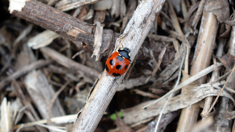 また、花にはハチやアブのなかまが頻繁に訪れ、陽だまりでじっとしているナミテントウなども見られました。腐葉土の中や朽ち木の中など目につかないところでも活動を始めている虫たちがたくさんいます。