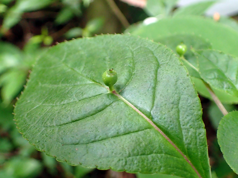 そんなある日、多摩動物公園昆虫園の裏手にあるエノキの葉に異変が起こっていました。なんと、葉の裏にも表にもとんがり頭がにょきにょきと並んで生えているではありませんか。これはどうしたことでしょう。つぼみ? 実? 葉の上に花を咲かせる植物として「ハナイカダ」が有名ですが、エノキにそういった特徴はありません。