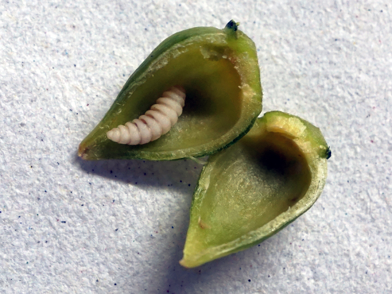 調査のためにひとつだけ失礼して中を見させてもらうと、中はきれいな空洞で、体長3~4ミリほどのウジムシ状の幼虫が確認できました。虫こぶは6月頃成熟して地面に落下し、幼虫のまましばらく虫こぶの中で過ごします。なんとそのまま冬を越し、春を迎えると蛹になって3~4月頃ようやく羽化するようです。とんがり頭の虫こぶはエノキトガリタマバエにとっては大事なゆりかごなのでした。