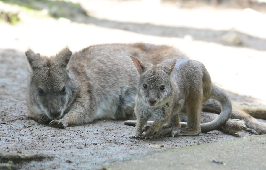 多摩動物公園のオーストラリア園では、パルマワラビー、シマオイワワラビー、ケナガワラルー、アカカンガルーの4種類のカンガルーを飼育しています。いずれも母親がおなかの袋で子どもを育てる有袋類で、繁殖期には子どもが袋から顔を出しているようすを見ることができます。