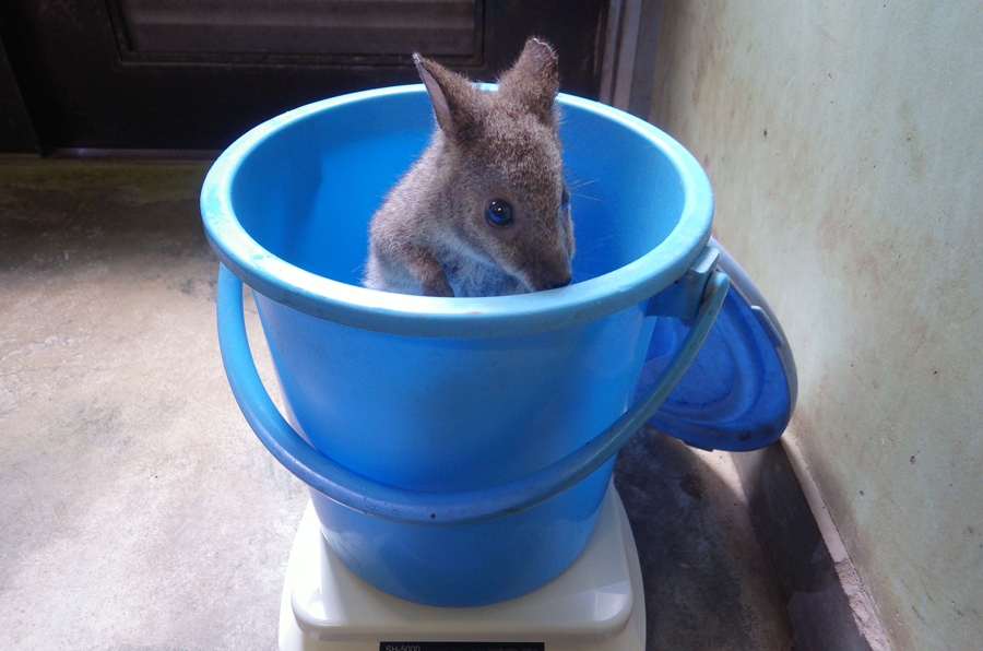 治療にあたり、母親以外のワラビーにふたたび傷口をかじられてしまわないよう、親子2頭を別の部屋に隔離することにしました。しかしワラビーはすぐれた運動能力をもっています。そのジャンプ力とスピードで、捕獲用の網を軽々と跳び越えてしまいます。まだ小さくて元気もない子どもを捕まえることは難しくありませんが、母親の捕獲は4人がかりでおこない、なんとか隔離することができました。