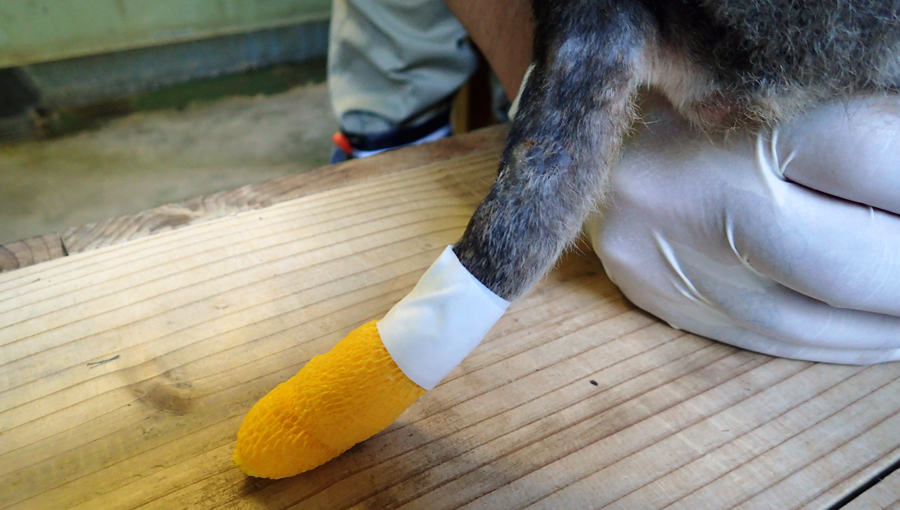 4種類のうち、体がいちばん小さいのがパルマワラビーです。2019年5月、パルマワラビーの子どもが尾をかじられ、短くなっていると連絡を受けました。雑食性であるワラビーは、他の個体の傷口をなめてしまうことがあります。今回、傷のできた尾をおとなたちが舐め、子の尾は本来の約3分の2、10センチほどにまで短くなり、皮膚が大きくむけてしまっていました。体も同月齢の個体にくらべて小さく、元気もあまりありません。