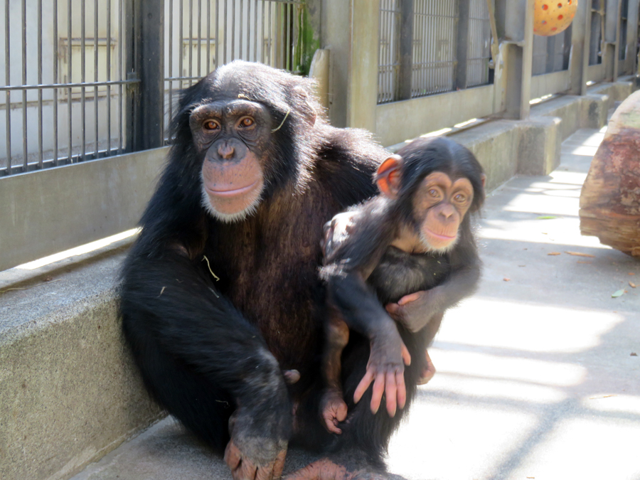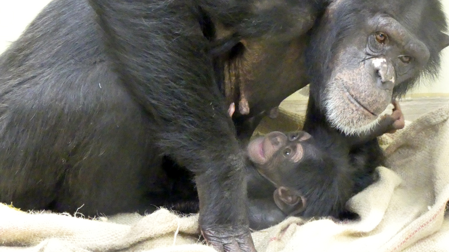 母親「モモコ」は4回目の出産、ベテランのお母さんです。分娩は私たち飼育係の目の前で始まりました。自分で子を受け止め、臍帯を切り、胎盤もすぐに食べてしまいました。弱々しく見える生まれたての子をモモコはしっかりと胸に抱き、私たちを安心させてくれました。目は人間の子と同じように斜視気味でしたが、生後3週間ほどで顔つきがしっかりしてきました。