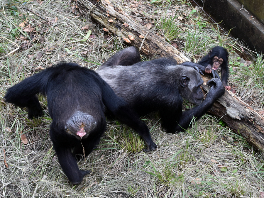 モモコがイブキを抱いていると、メスの「ミル」や「ベリー」、そしてオスの「ジン」も近寄って来て、覗きこんだり、モモコに対してグルーミングをしていました。そのようすは、「赤ちゃんに優しくするから信用してね、抱かせてね」と言っているかのようでした。しかし警戒しているモモコはすぐに触らせてはくれません。するとミルが「少しだけでいいから触らせて!」と言うかのように騒ぎ、群れの仲間たちから呆れられていることもありました(ニュース)。