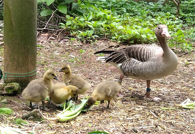 多摩動物公園のたまご広場の隣にあるサイ上コウノトリ舎では今年、ハイイロガン4羽の自然育雛に成功しました。