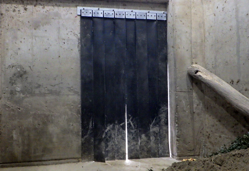 夜間放飼は運動量の増加や行動パターンの増加といったプラスの効果が期待できます。しかし、扉を常に開放しているため、冬に暖房を稼働させていても室内の温度が上がらないという問題を抱えていました。そこで2023年の春にゾウ舎の室内から運動場への出入り口にゴム製シートで作ったカーテンを設置しました。