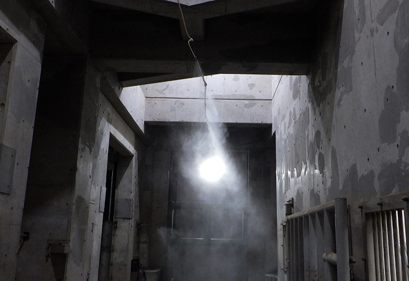しかし、どれも多少の効果はありましたが、室内の湿度を大きく変えることはできませんでした。そこで、以前夏に使用していたミスト装置をゾウの鼻が届かない室内通路へ設置し、ミストを拡散してみることにしました。