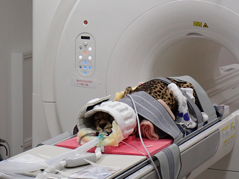 今回、2025年11月9日に、当園で飼育するチーターの鼻腔内病変の検査治療を日本獣医生命科学大学付属動物医療センターにて実施しました。当園獣医師及び飼育係と動物医療センターの獣医師および愛玩動物看護師が連携し、MRI検査、内視鏡検査と鼻腔から口腔内へ通じる瘻管の縫合治療をおこない、正確な病状把握と適切な治療を施すことができました。