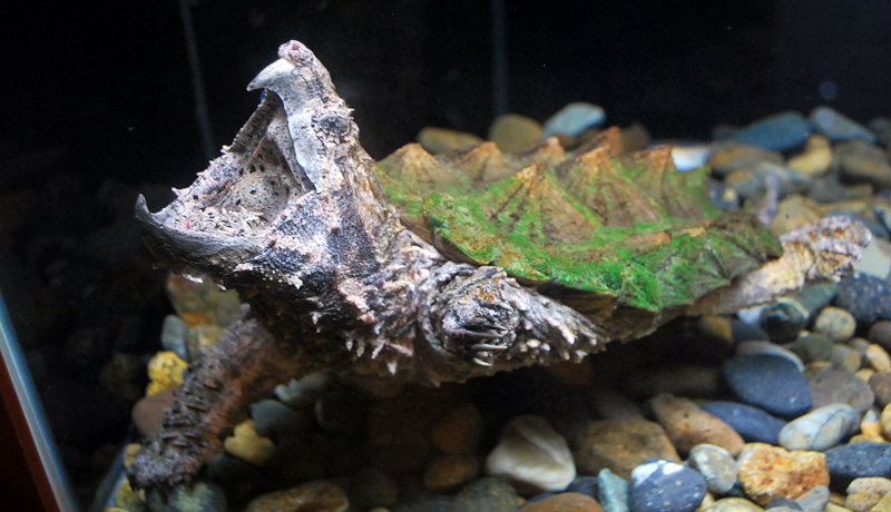 展示の一部をご紹介しましょう。みなさん、ワニガメというカメはごぞんじでしょうか。ワニガメはアメリカに生息しているカメですが、ときには日本の湖沼で見つかり、外来種として話題になることもあるので、名前は知っている方も多いかもしれません。