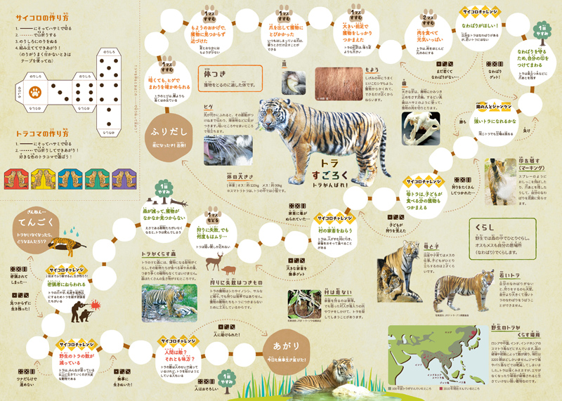 「すごろくで学びタイガー」というタイトルどおり、すごろくで楽しく遊びながら、トラについて学ぶことができるパンフレットです。