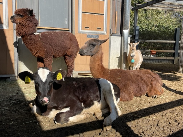 来園当初、子ウシはラマ・アルパカ・ヤギと同じ放飼場でくらしており、よくラマ(オス)に寄り添って休息する姿が見られました。