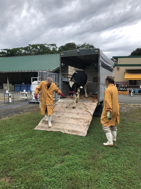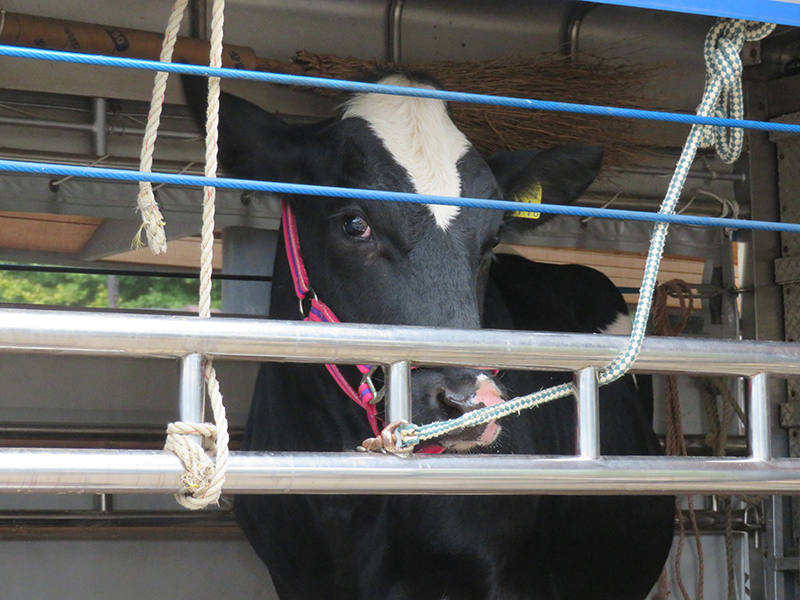 一般的に、ウシは家畜専用のトラックに乗せられて移動します。子ウシも牧場に帰る日にスムーズにトラックに乗ることができるよう、小さいころから人の指示に従って歩く練習をおこないました。