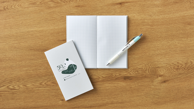 ノートの表紙には「ジャイアントパンダ来園50周年記念」のロゴ、裏面には上野動物園の5頭のパンダとWWFパンダロゴを配したデザインです。手帳を持ったままメモを取ることができる、ハードカバーで胸ポケットに入るサイズです。