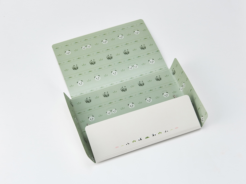 表紙には「ジャイアントパンダ来園50周年記念」のロゴ、裏面には上野動物園の5頭のパンダアイコンをあしらっています。内側にも上野のパンダとWWFパンダロゴがたくさんプリントされています。バッグの中でくしゃくしゃになりがちなプリントや書類を入れて持ち運ぶのに便利な、紙製のドキュメントケースです。