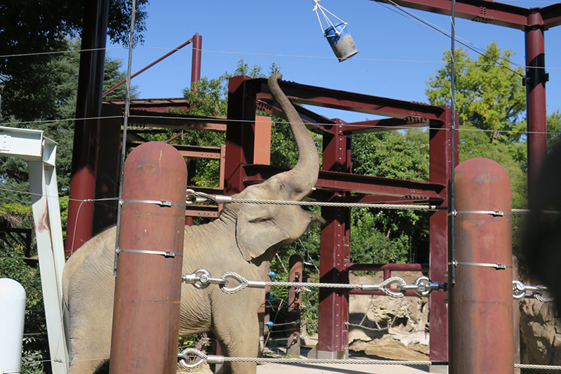 しかし、工事はまだ続くため、私たち飼育係はさまざまな工夫をおこなっています。ゾウたちが少しでも外にいる時間を増やすため、工事をしていないときには可能な限り放飼場の寝室側の部分まで出すようにし、外気にふれ、日光を浴びる時間を確保するとともに、ゾウたちが好む砂浴びの機会を提供しています。