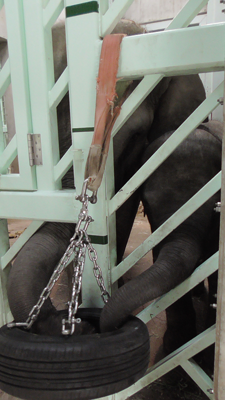 また、その日のゾウの状態や天候によっては放飼場の吊るしフィーダー(なかにえさを入れ、高い場所に吊るす給餌器)を出しているほか、長い時間をすごす室内でも遊べるよう、タイヤやブイを使用した遊具も設置しています。新しい遊具を設置すると、アルンはすぐに興味を持ち、積極的に遊んでいるようすが観察されています。さらに、工事前におこなっていた健康管理のためのトレーニングも屋外、屋内の両方で徐々に再開しています。
