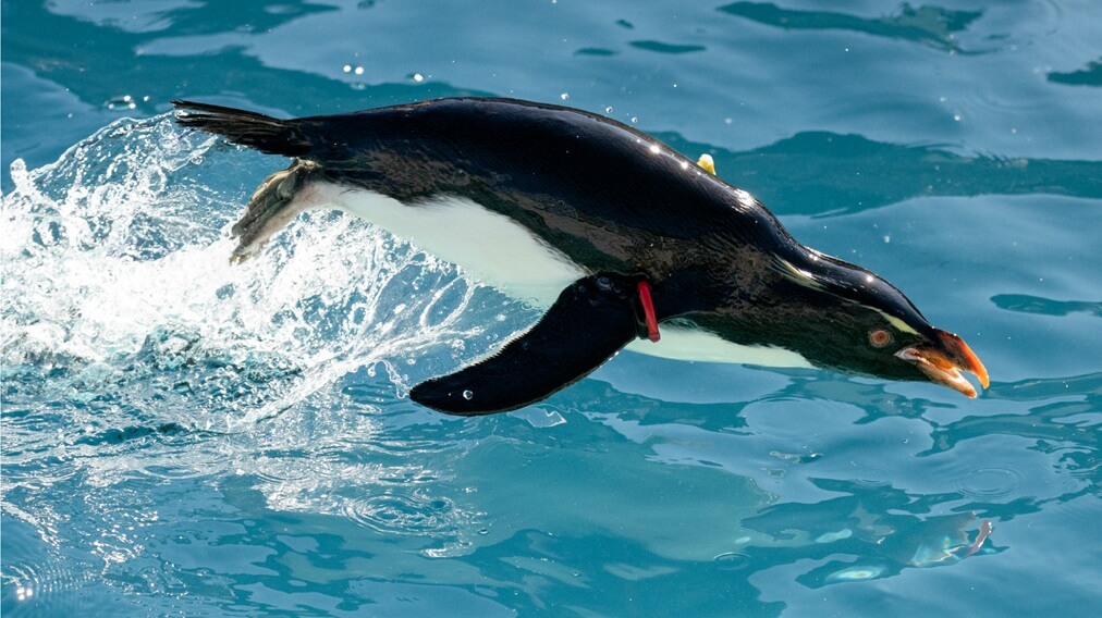 Eudyptes chrysocomeペンギンの多くは左右に体をゆらしながら歩きますが、イワトビペンギンは両足をそろえてピョンピョンと飛び跳ねます。岩から岩へとび移りながら移動し、ひととびが2mになることもあります。繁殖期以外は海でくらし、繁殖期になると南アメリカのホーン岬やフォークランド諸島の島々に集団で巣をつくります。