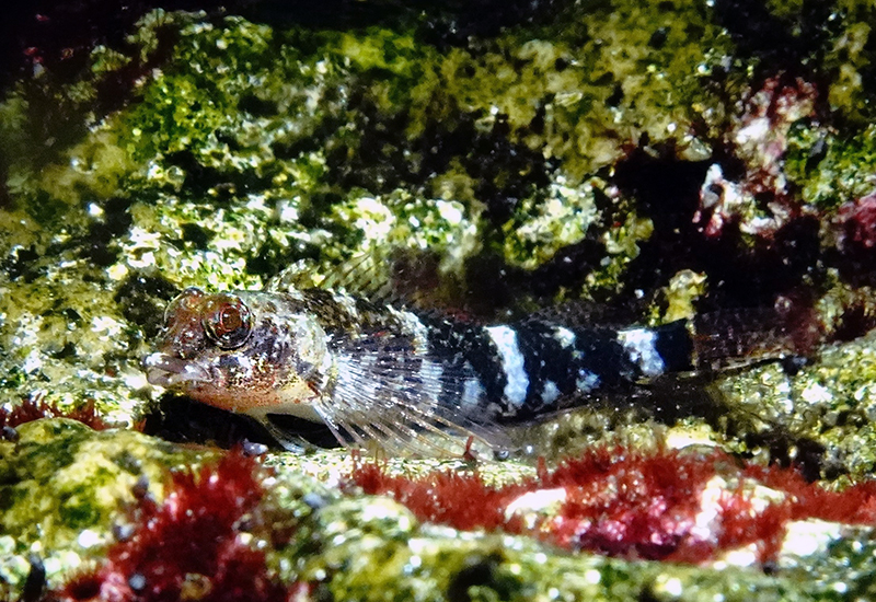 まずは「ヘビギンポ」です。名前にヘビと付きますが体は細長くありません。そんなヘビギンポですが、口先がとがっていて物陰から顔だけを出しているさまが、なんとなくヘビに見えませんか? 水槽内では、垂直に立った岩にも器用に体を固定させ、物陰からきょろきょろと周りを見回している姿をよく目にします。みなさんもこの魚のヘビに見えるポイントを観察してみてはいかがでしょうか。