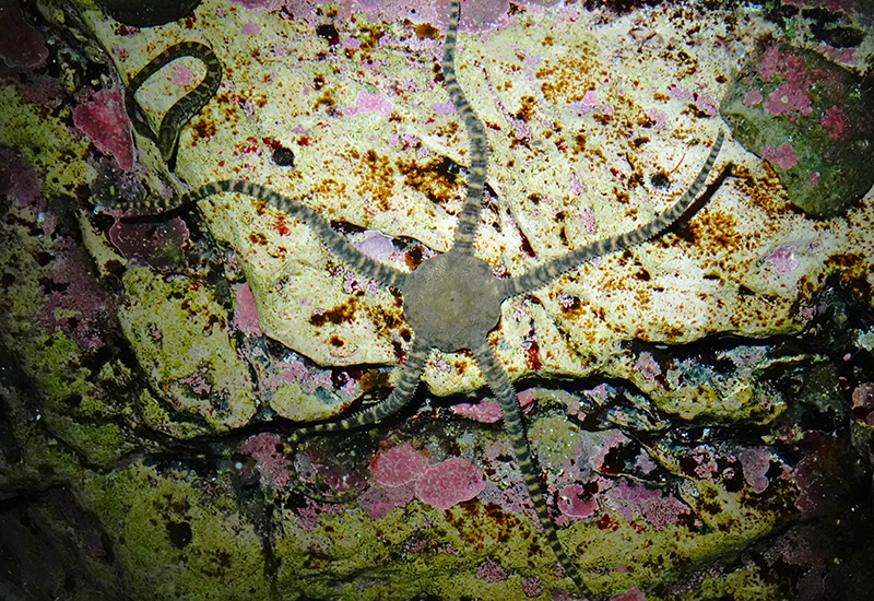 続いては「ニホンクモヒトデ」です。名前に「クモ」は入っていますが、ヘビはどこなの?と思った方もいるかもしれません。じつは学名の中にヘビが隠れています。”Ophiuroidea”がクモヒトデ綱の学名で、「Ophis=ヘビ、ura=尾、oid=のような」という意味なのです。