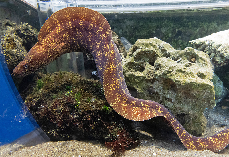 ここまでヘビにちなんだ生きものを紹介してきましたが、「しおだまり」コーナーで見た目が一番ヘビっぽい生きものは「ウツボ」だと私は思います。名前はヘビと関係ないのですが、胸びれと腹びれがなくにょろにょろとした姿や、歯が鋭いところなどが似ていて、ヘビが苦手な方はウツボもあまり好きではないかもしれません。しかし小さな丸い目や、ヘビとは違う表面に鱗がなくムチムチとした分厚い皮膚で覆われた体を間近で見てみると、少しは魅力に気がつけるかもしれません。